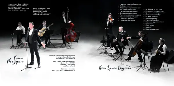 1. Надежды маленький оркестрик 2. Ещё один романс 3. Живописцы 4. Вот так она любит меня 5. Песенка о дальней дороге 6. Он, наконец, явился в дом 7. Песенка о московском муравье 8. Песенка об открытой двери 9. Парижская фантазия 10. По Смоленской дороге 11. Не бродяги, не пропойцы 12. Музыкант 13. Прощание с новогодней ёлкой 14. Синий троллейбус 15. На фоне Пушкина снимается семейство 16. Надпись на камне 17. После дождичка 18. Грузинская песня 19. Три сестры 20. Союз друзей (старинная студенческая песня) 21. Молитва (Пока земля ещё вертится) 22. Пожелание друзьям Музыка и слова Булата Окуджавы. Аранжировки Андрея Иванова. Олег Погудин – пение; Елена Молотилова – домра малая; Ирина Козырева – домра альт; Михаил Радюкевич – гитара; Олег Гулевский – баян; Алексей Баев – скрипка; Андрей Иванов – виолончель; Роман Тентлер – контрабас. Записано на Петербургской студии грамзаписи, 3 ноября и 13 декабря 2024 года. Звукорежиссёр - Кира Малевская. Фото – Антон Ланге, Алексей Климов. Дизайн – Нина Ветрова. Продюсер – Олег Грабко © 2025, Булат Окуджава, наследники. © 2024, Олег Погудин, исполнение. |